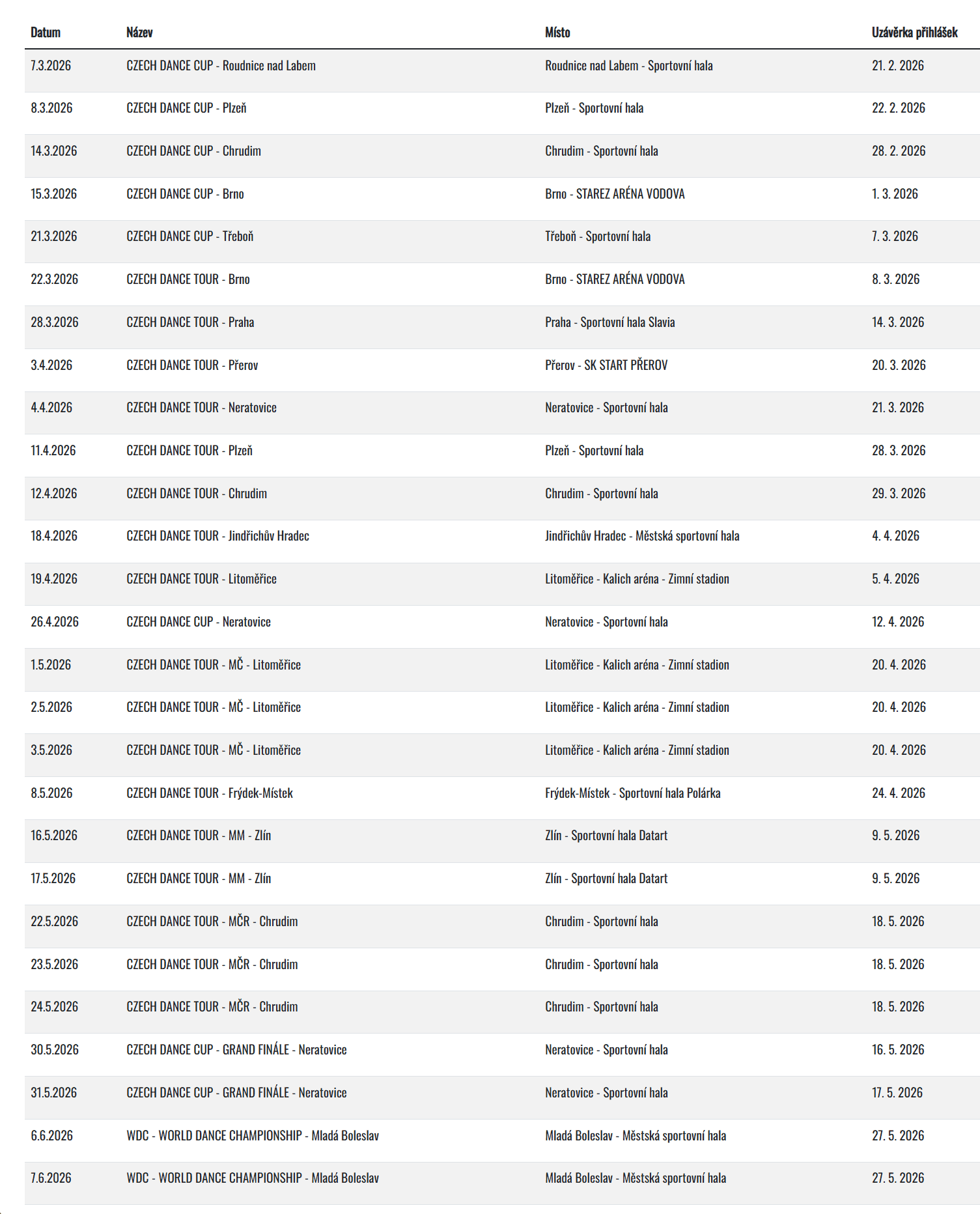 TERMÍNY SOUTĚŽÍ – jaro 2026 na webu:
